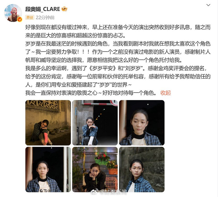 [#段奥娟回应提名金鸡奖影后#]#段奥娟说会保持对表演的敬畏心#9月26日,金鸡奖最佳女主角提名名单公布盈策略,@段奥娟_CLARE凭借《岁岁平安》首次提名金鸡奖。随后,段奥娟发文:“岁岁是在我最迷茫的时候遇到的角色,当我看到剧本时我就在想我太喜欢这个角色了~我一定要努力争取!!!作为一个之前没有演过电影的新人演员,感谢制片人帆哥和臧导坚定的选择我,愿意相信我把这么好的一个角色托付给我......我会一直保持对表演的敬畏之心~好好地对待每一个角色。”#段奥娟[超话]#